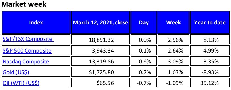 With strong economic recovery expected this year, and the prospect of continuing monetary accommodation and low rates until at least the end of 2022, investors had reason to be optimistic about the Canadian market. Boosting sentiment even more was gain of 259,000 new jobs in February, as the unemployment rate dropped to 8.2% from 9.4% in January. A weaker U.S. dollar also added to gains, as a 9.2% weekly advance in the S&P/TSX Health Care Index led broad gains in the S&P/TSX Composite Index, which ended the week up 2.6% from the previous Friday’s close, and ahead 8.1% for the year to date. Crude oil, meanwhile, retreated 1.1% on the week, but remains ahead 35% for the year to date. An ounce of gold gained 1.6% for the week, but remained down 8.9% for the year to date.
