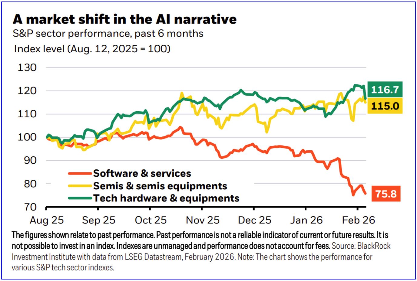 New AI agents can take on software-linked tasks, for example, potentially eroding the competitive moat some software companies have enjoyed for decades. The change in the AI narrative has triggered indiscriminate selling of these firms, resulting in a marked performance divergence within tech sectors.