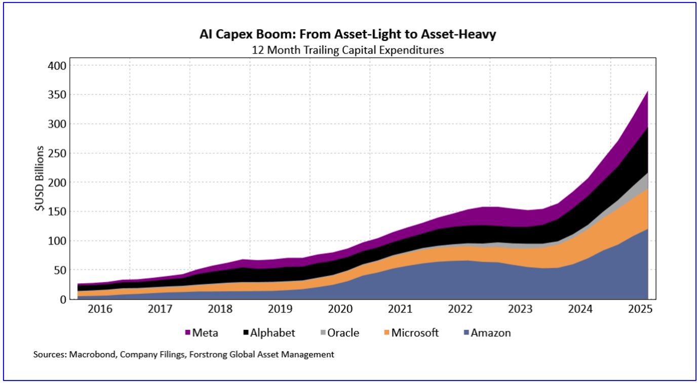 Never has the world seen such extreme divergences. Two trends stand out. First, all things AI. Corporate spending on artificial intelligence now accounts for roughly half of U.S. GDP growth this year. AI-linked companies alone have delivered nearly 80% of the S&P 500’s gains in 2025.