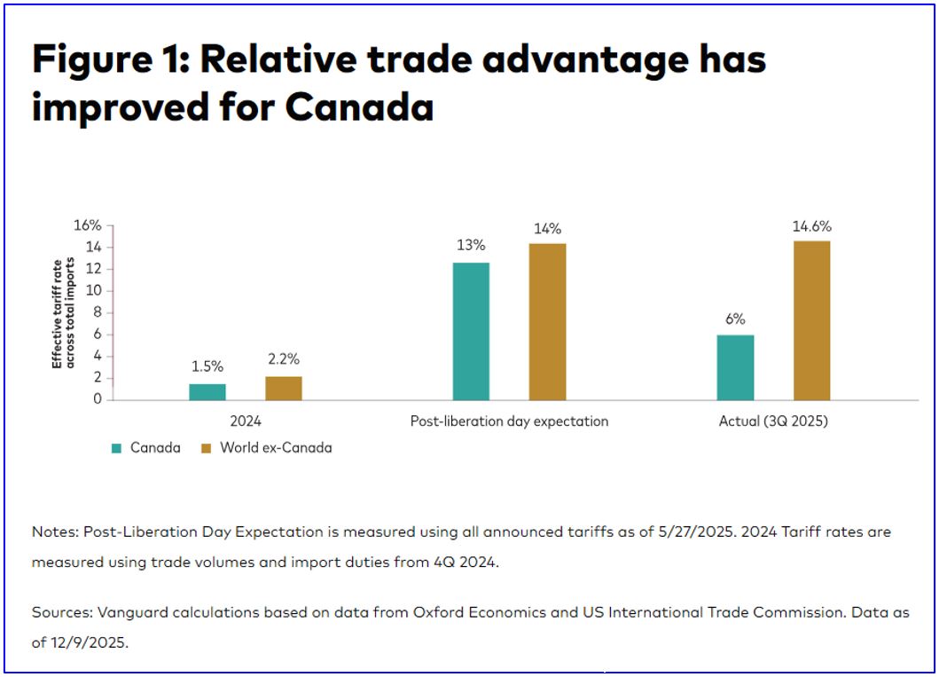 Canadian industries have adjusted to the new tariff landscape and strong growth in the U.S. should provide support for Canadian exporters, where global growth fears in 2025 weighed heavily on business investment. Canada retains a structural advantage, one of the lowest effective tariff rates among U.S. trading partners, positioning the country to capture greater trade share as supply chains normalize.
