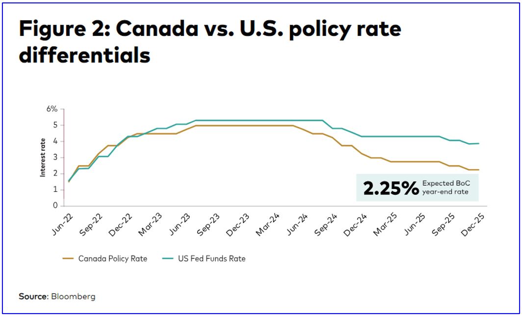 As we have mentioned in our previous outlooks, Canadian fiscal policy initiatives such as large-scale infrastructure spending, housing programs, clean economy tax credits, and defence commitments will set a floor on how low interest rates can fall because they inject significant and sustained demand into the economy. With fiscal stimulus supporting growth and employment, the Bank of Canada will have less need to cut rates aggressively to spur activity.