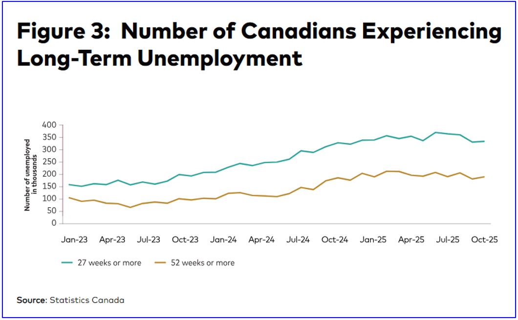 Additionally, a stronger Canadian dollar has already reduced import prices and is anticipated to remain resilient through 2026, reinforcing the cooling trend. On the labor market front, as shown in Figure 3, the number of Canadians experiencing long-term unemployment has stabilized at an elevated level since mid‑2023, adding slack to the economy and contributing to weaker wage growth and subdued consumer spending, further dampening core inflation.