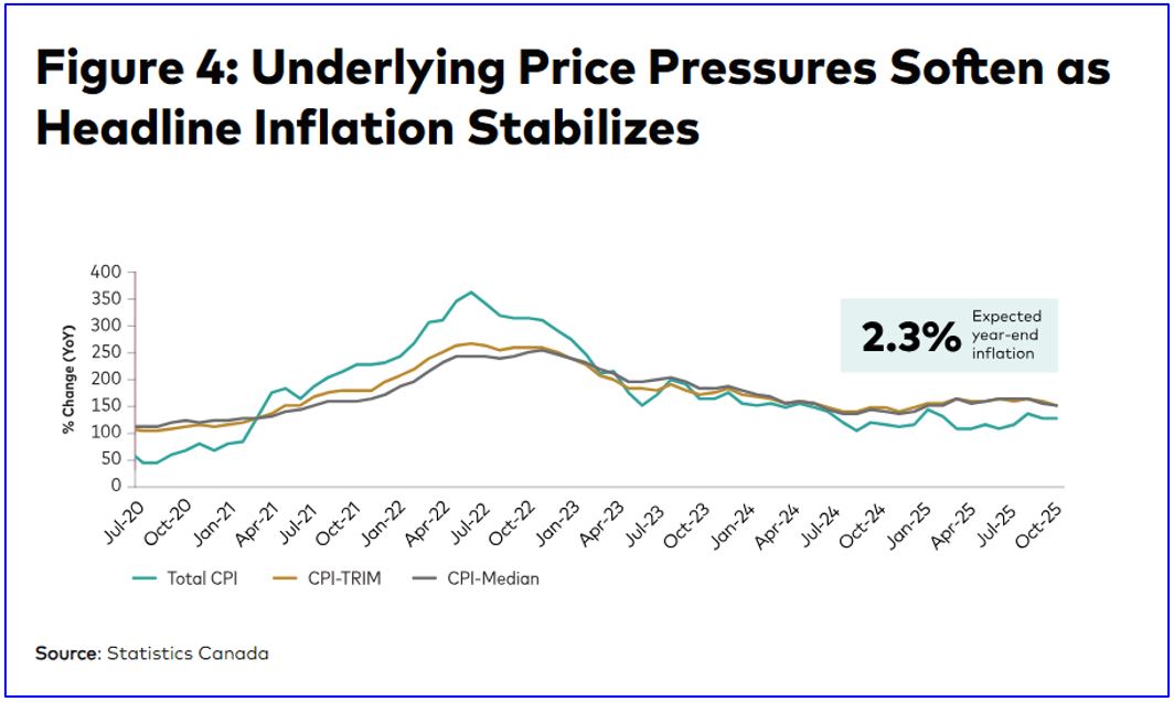 Figure 4 shows inflation measures easing in November, with CPI-median and CPI-trim declining to roughly 2.8% from 3.0% in October, indicating that underlying price pressures are moving closer to the Bank of Canada’s target range. This moderation is expected to persist into 2026.