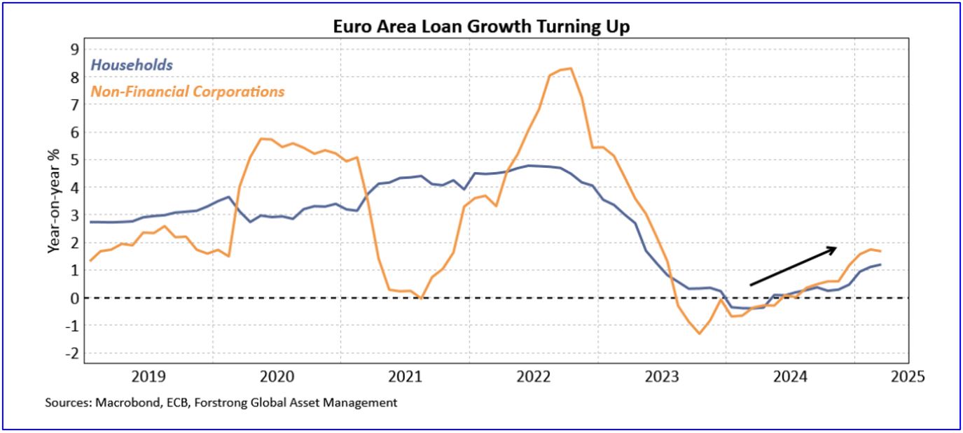Per the chart below, Euro Area loan growth is now accelerating for both households and businesses. Banks’ strong capital positions are fueling buybacks and M&A activity, while a positively-sloped yield curve supports net interest margins. Southern Europe has deleveraged and is growing without systemic imbalances.