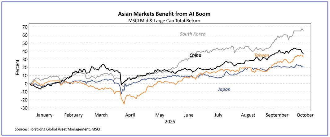 And AI? The spending spree is going global. Sam Altman’s recent “shopping trip” in Asia sparked deals in Taiwan (GPUs), South Korea (memory chips), and Japan (power transmission equipment). The ripple effects from this AI capex boom – jobs, production, and technological growth – are now being felt far beyond the U.S. For now, the AI game is still very much on.