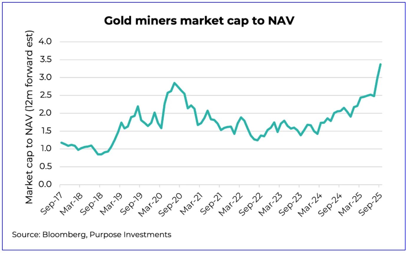 Technically speaking, things are extended. The RSI (relative strength) of gold bullion is 71, TSX miners 78. Usually, anything over 70 is a sell signal. And while earnings have expanded, share prices have risen much faster. The chart below shows the total market cap of miners compared with their net asset value based on forward 12-month estimates. Valuations are a tough one, and our old rule of thumb is that when folks start talking valuations regarding gold companies, we should be concerned.