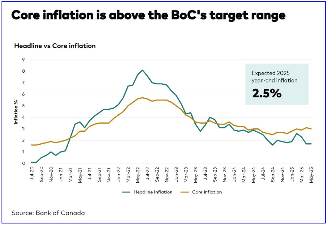 We expect aggregate demand to slow due to several factors including a rise in unemployment and stalled population growth resulting in slowing economic activity that should keep inflation within the BoC’s target range of 1.0% to 3.0%. We expect year-end inflation to be 2.5%. Elevated mortgage rates, relative to pre-pandemic lows, implies that Canadians have less discretionary income. Additionally, continued uncertainty around U.S. trade policy has put downward pressure on inflation as businesses hold back on hiring, spending, and investing. Consumers are also holding back on purchases, particularly big-ticket items.