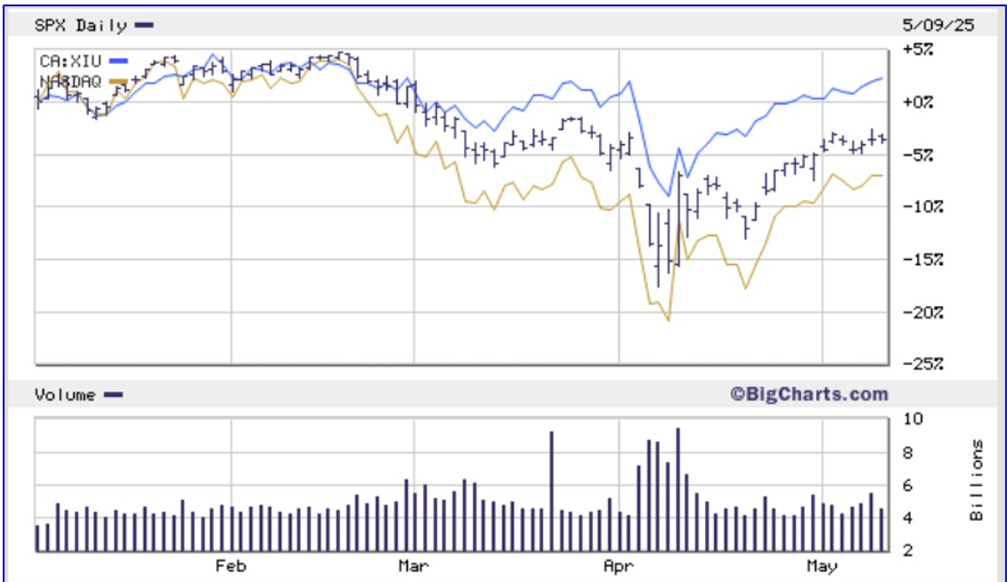 At the time of writing, U.S. equity markets were still below 2024-year-end levels (see chart below) but had made a remarkable recovery from the post-liberation day selloff. Perhaps more remarkable is the year-to-date performance of the Canadian market as measured by the iShares S&P/TSX 60 Index ETF (TSX: XIU), that is up 3.00% since the end of 2024.