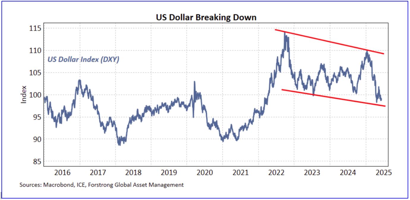 Bond and FX markets are shifting focus – from rate differentials to fiscal credibility. Case in point: The U.S. dollar is down nearly 10% against the euro this year, despite the European Central Bank cutting rates by 75 basis points while the Fed stood pat. U.S. yields are rising, but the dollar isn’t following. Expect this to continue. Global asset allocators need to take note and prepare for this new regime.