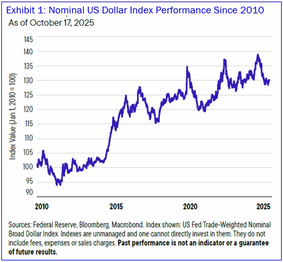 Year-to-date, the trade-weighted value of the U.S. dollar has fallen by about 10%. Various factors suggest its decline is not yet over. Among them are probable further Fed rate cuts owing to a softening US labor market. Shifting global portfolio flows, reflecting more attractive equity and fixed-income opportunities outside the United States, should also contribute to dollar weakness.