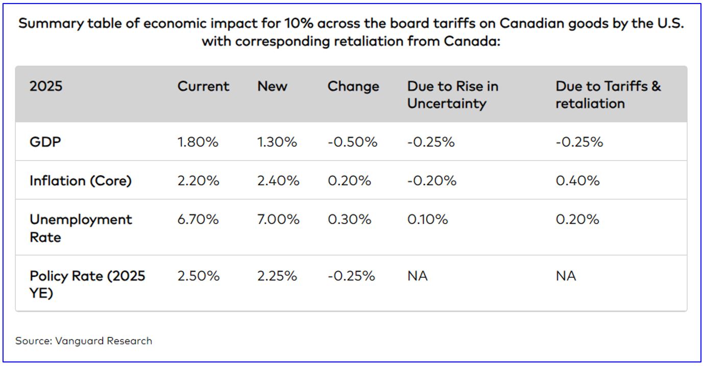 Heightened policy uncertainty in Canada amid an escalating trade conflict has lowered growth prospects and raised concerns about supply chain disruptions, and negative impacts on business investment, unemployment, and consumer spending. The table below summarizes the changes to our outlook based on changes in tariff policies.