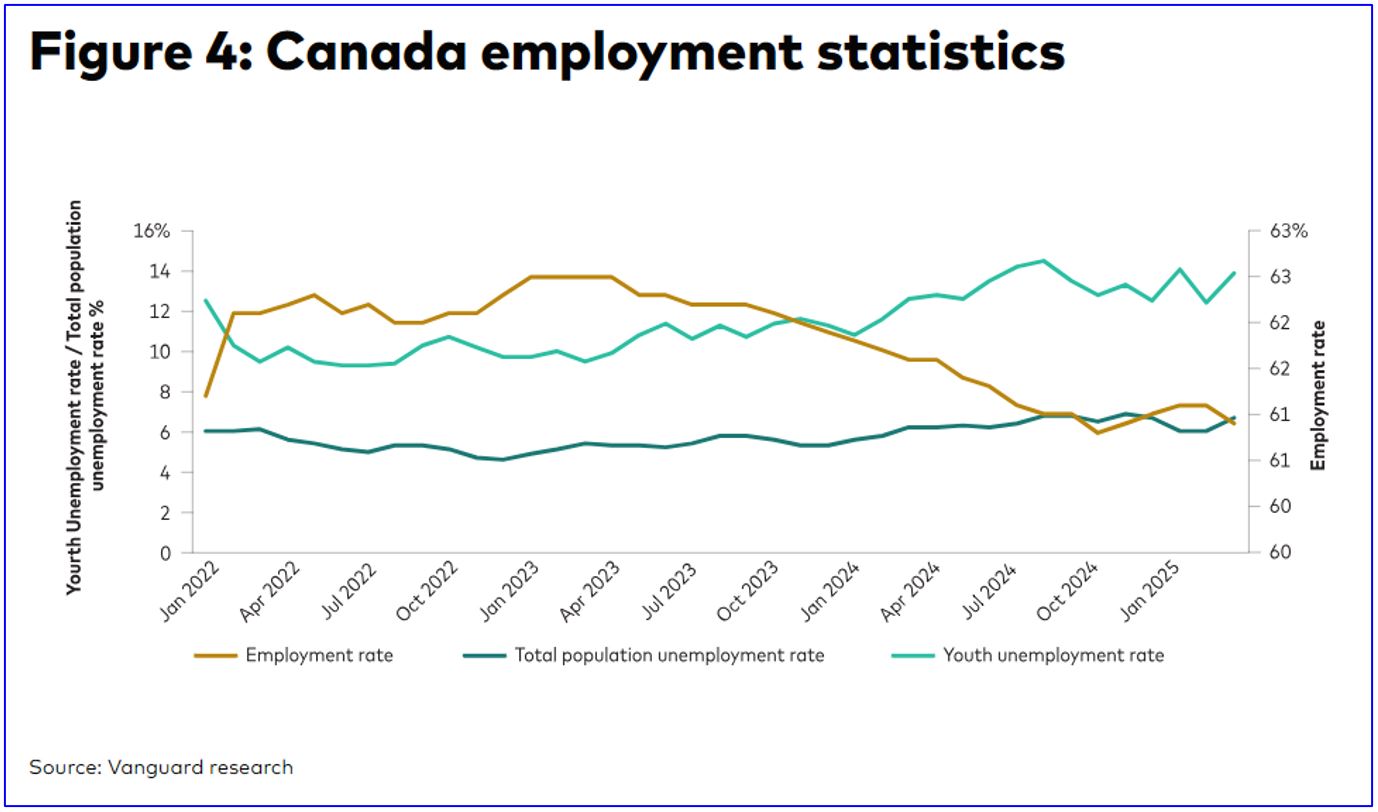 These tariffs will have a negative impact on final domestic demand, slowing business and residential investment and consumer spending. The consumer confidence index fell to 44.2% in March, its lowest level in history. Figure 3 shows Canadian economic momentum is worsening, although leading indicators still point at trend growth, partly due to a frontloading of tariffs, which increased by 7.5% during the first quarter of 2025, in anticipation of tariffs.
