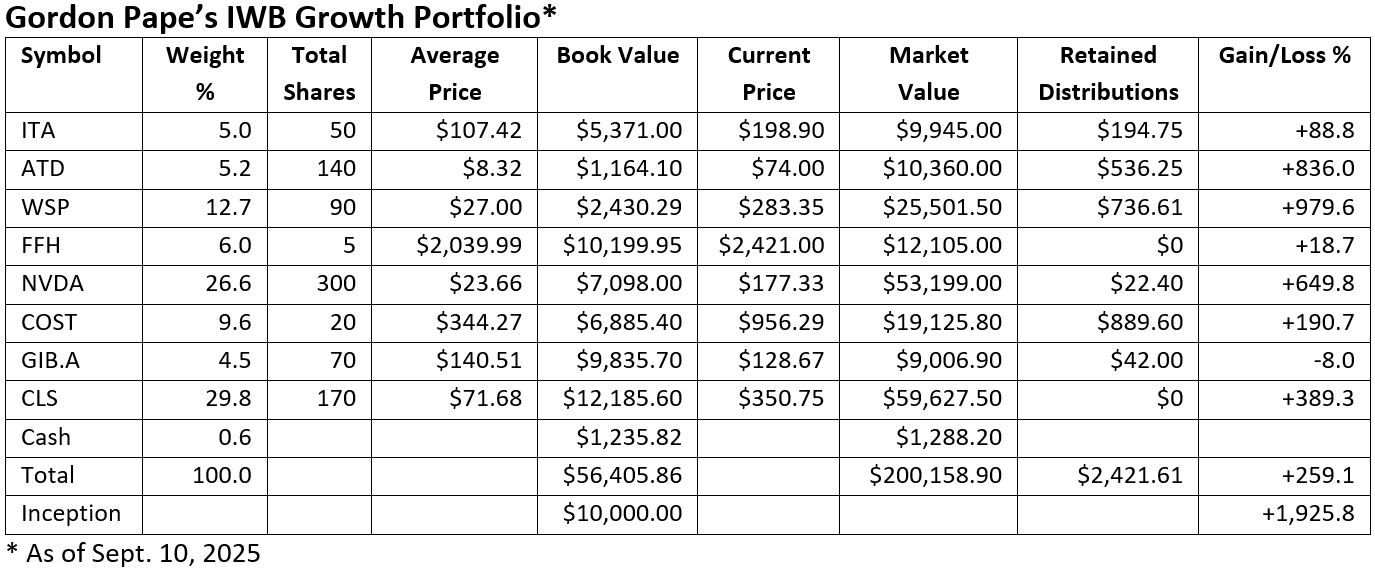 As far as I can recall, this was the best six-month gain since the portfolio was launched. Our stocks were up 35.31%, with big contributions from ITA, FFH, NVDA, and CLS. The only losers were Costco and CGI.
