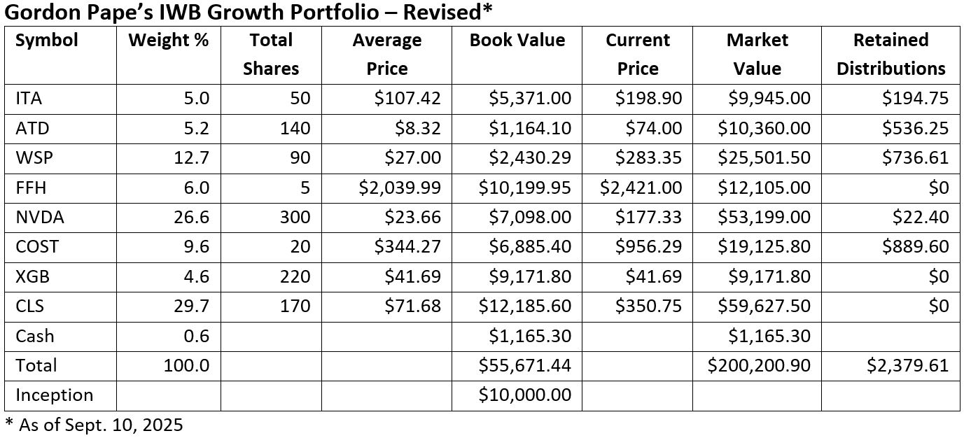 Here is how the portfolio stood at the close of trading on Sept. 10. Commissions are not considered. The U.S. and Canadian dollars are treated as being at par, but obviously, gains (or losses) on the American securities are increased due to the exchange rate differential.