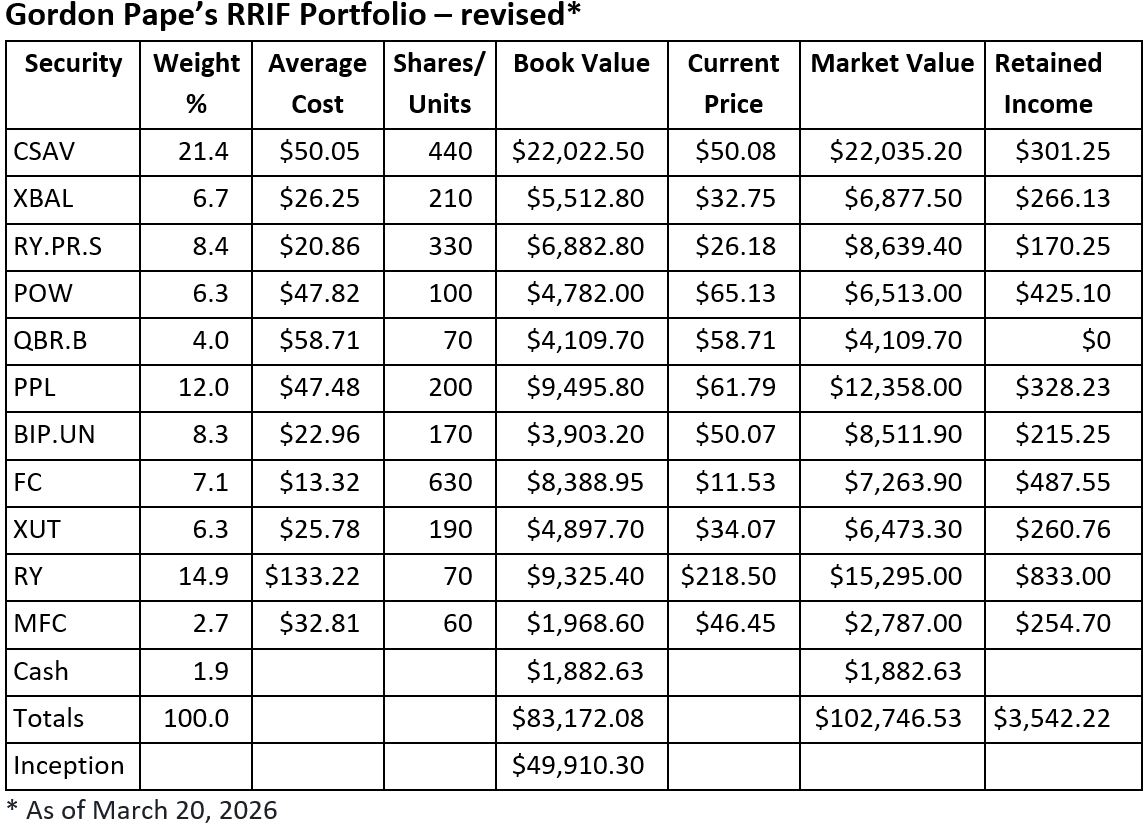 Here’s a look at the RRIF Portfolio as it stood on the afternoon of March 20. Note that commissions are not deducted. Although this is a RRIF portfolio, withdrawals are not factored in, as this would make it impossible to track performance accurately.