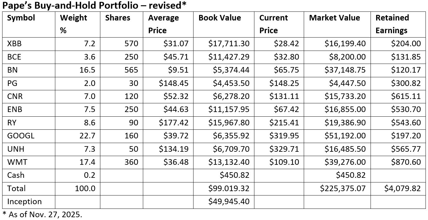 Here is the status of the portfolio as of Nov. 27. The Canadian and U.S. dollars are shown at par, but obviously the U.S. holdings are doing better thanks to the strength of the greenback. Trading commissions are not factored in, although in a buy-and-hold portfolio they are not significant.