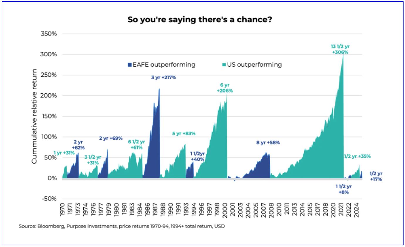 This wasn’t always the case, as there have also been extended periods when EAFE or international equities outperformed the U.S. Now, with EAFE up about 13% so far in 2025 and the S&P 500 down over 3%, folks are talking international once again. Will this be yet another false signal, or is this cyclical dance finally changing tunes?