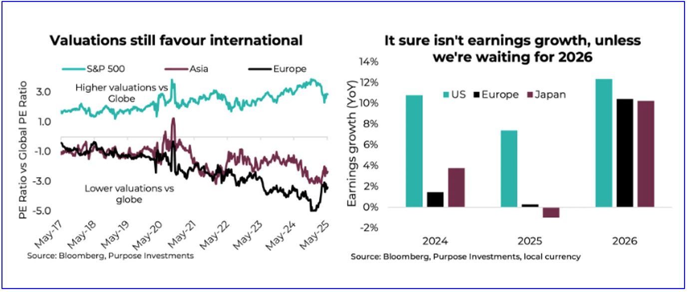 So could we be entering a long period of international outperformance versus the U.S.? The setup is in place, but it has been in place for many years. Valuations naturally favour international, but that is usually the case given the sector differences and the valuations of those relative sectors.