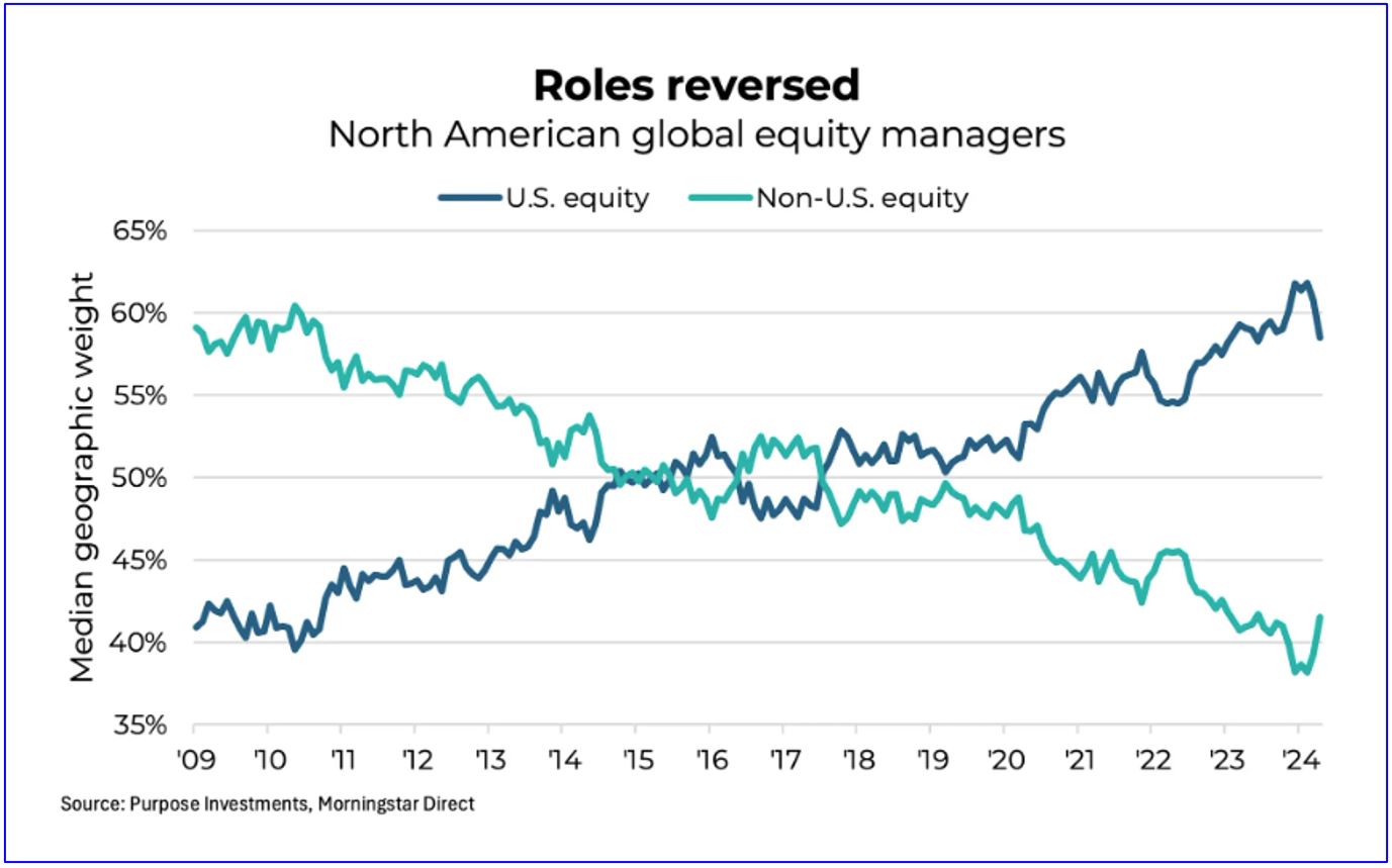 If the cycle has changed to favour international, the challenge for many portfolios will be a preponderance of U.S. equity overweights and subsequent international underweights. This isn’t just at the client portfolio level. A common theme in multi-asset portfolios today is to rely on global equity managers for international exposure, but these days, “global” is often just shorthand for “mostly U.S.”