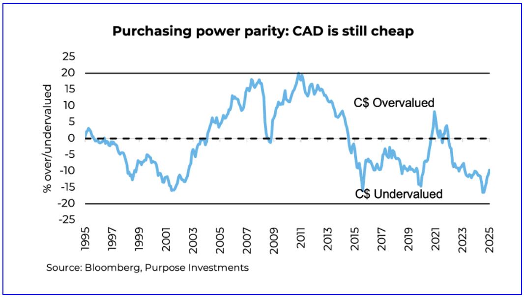 Even after the recent rise in the CAD vs USD so far in 2025, we believe the CAD is still cheap or undervalued. But it has been for most of the past decade, as it was overvalued for the previous decade. These are very long and slow-moving cycles. Taking a really long view, the CAD was a dog during the ’90s, the USD was a poor performing currency in the ’00s, and then the CAD sucked again in the ’10s to 2025 so far.