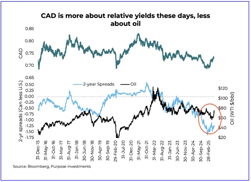 And then there’s the rest of the factors, many factors, driving near-term volatility in exchange rates. The CAD has often been influenced by oil prices, but this relationship was stronger pre-2020 than it has been lately. Conversely, changes in short-term relative yields between Canada and the U.S. have become a larger determinant. A narrowing of the spread between two-year yields has supported the Canadian dollar rebound, as has the spike in oil prices as Middle East conflicts intensify.