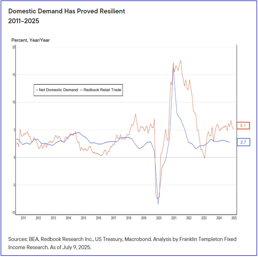 Corporate America has so far reacted to policy uncertainty with caution but not panic. Sentiment surveys remain subdued, but we have not seen the retrenchment and extensive layoffs that many feared. At this pace, I expect U.S. gross domestic product (GDP) growth could comfortably exceed 2.0% for the full year 2025.
