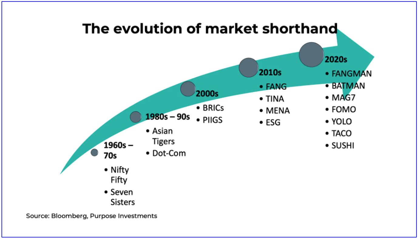 Simplifying investment narratives isn’t new. In the 1960s, you had the “Nifty Fifty,” a quick shorthand that described the top stocks of the day, which were very popular despite excessive valuations. Skip forward a few decades, and you had the rise of the “BRICs,” driven by globalization narratives. “FANG” and all the subsequent variations have been around for over a decade. They reflect Big Tech’s dominance and growing concentration risk.