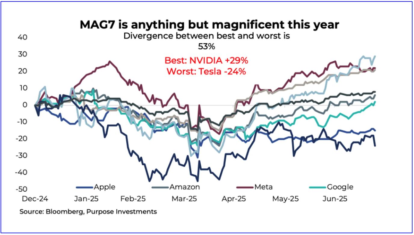 Even the “MAG7” is now dated. In aggregate, the group has lagged, up just 5.5%. There is nothing magnificent about Apple’s and Tesla’s performance this year, down -15% and -24% respectively. The divergence across the group is high: 53% separates the best (NVIDIA) from the worst (Tesla).