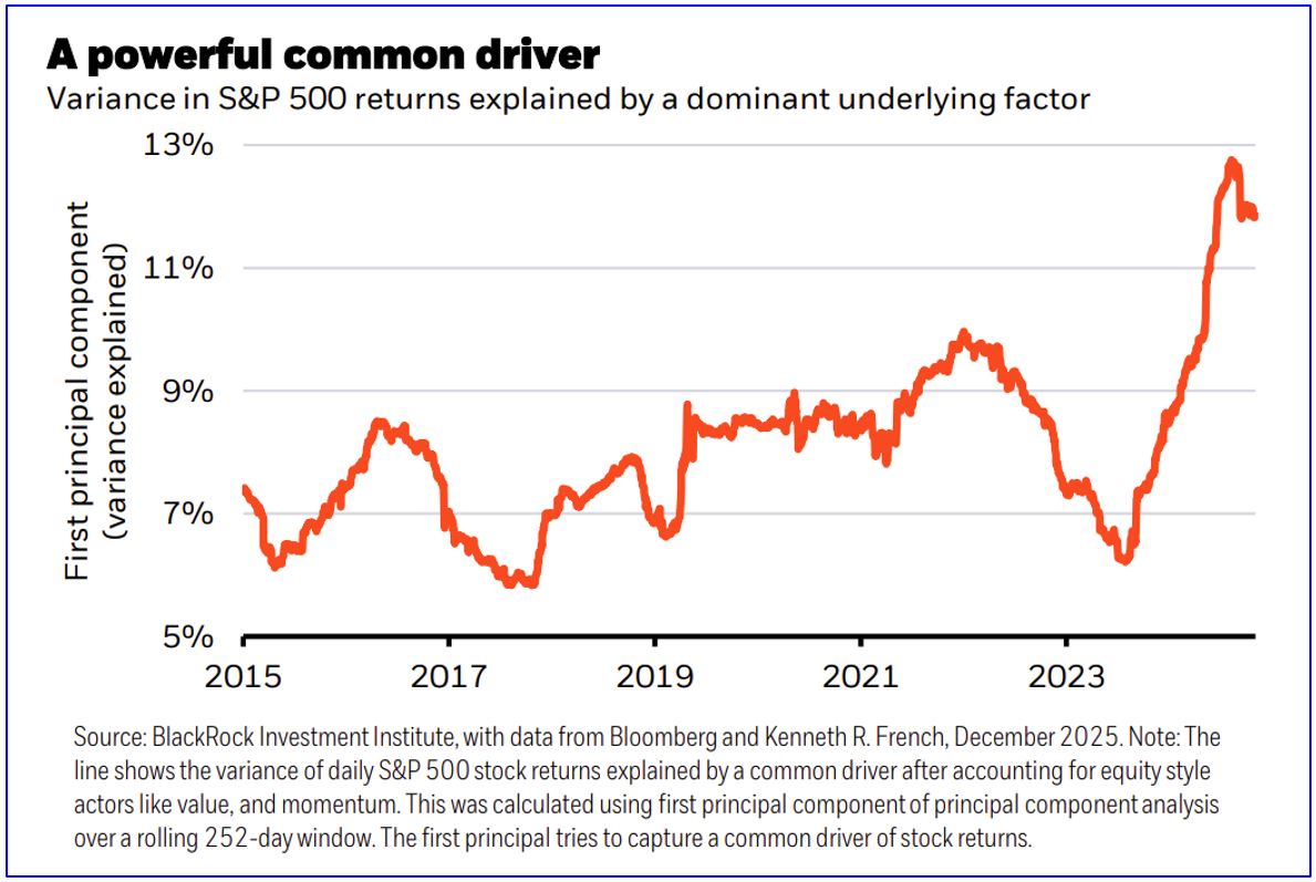 For a few years, we have laid out how the economic transformation of mega forces challenged traditional methods of portfolio diversification. In this environment, efforts to diversify away from the U.S. or the AI mega force amount to larger active calls than before. Our analysis shows that after accounting for factors that typically explain equity returns, a growing share of U.S. stock returns are tied to a single, common driver (see the chart below).