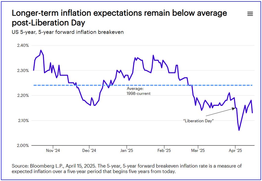Finally, it may be confirmation bias but…the market is not expecting stagflation. Rather, the market believes that the tariffs will result in a one-time price shock rather than broad inflation. In fact, the 5-year, 5-year forward inflation breakeven rate, which reflects the bond market’s expectations for inflation over a five-year period starting five years from now, initially declined following Liberation Day and remains below the long-term average (see chart below).8 The Federal Reserve will be inclined to respond to any economic weakness as long as long-term inflation expectations remain anchored.