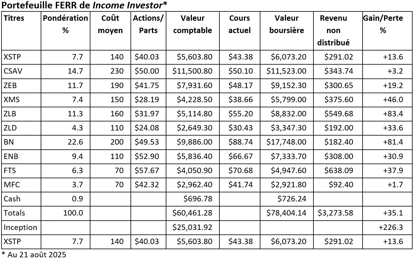Contenu © 2025 par Gordon Pape Enterprises. Tous droits réservés. Reproduction autorisée. Ce qui précède est à des fins d’information générale uniquement et n’engage que l’opinion de l’auteur. Les titres mentionnés présentent un risque de perte et aucune garantie de performance n’est établie ou implicite. Ces informations ne visent pas à fournir des conseils personnalisés spécifiques, y compris, mais sans s’y limiter, des conseils en placement, financiers, juridiques, comptables ou fiscaux. Demandez toujours conseil à votre propre conseiller financier avant de prendre des décisions en matière d’investissement.