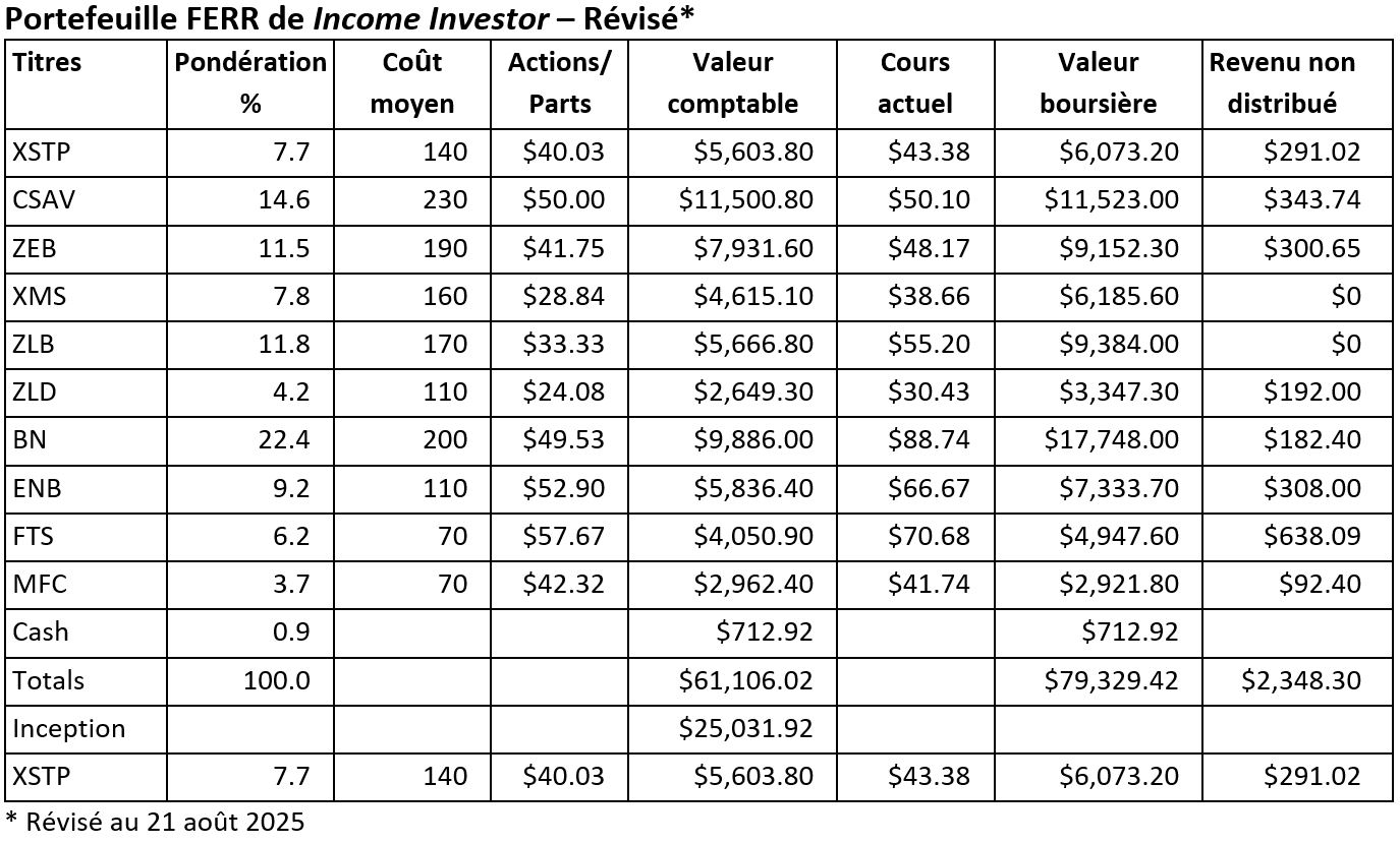 Voici où en était le portefeuille REER au 21 août. Les commissions n’ont pas été prises en compte. Tous les montants sont en dollars canadiens