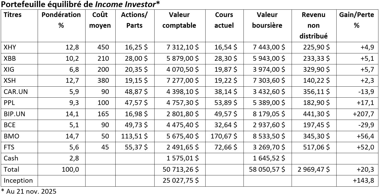 Contenu © 2025 par Gordon Pape Enterprises. Tous droits réservés. Reproduction autorisée. Ce qui précède est à des fins d’information générale uniquement et n’engage que l’opinion de l’auteur. Les titres mentionnés présentent un risque de perte et aucune garantie de performance n’est établie ou implicite. Ces informations ne visent pas à fournir des conseils personnalisés spécifiques, y compris, mais sans s’y limiter, des conseils en placement, financiers, juridiques, comptables ou fiscaux. Demandez toujours conseil à votre propre conseiller financier avant de prendre des décisions en matière d’investissement.