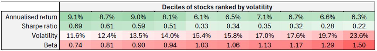 Comme on peut le constater, plus le bêta est faible (ligne inférieure), plus la performance annuelle est élevée (ligne supérieure). La relation n’est pas parfaitement linéaire, mais la tendance est claire. Les actions affichant un bêta de 0,74 ont généré un rendement annualisé de 9,1 %, tandis que celles dont le bêta est de 1,50 ont offert un rendement moyen de 6,3 %.